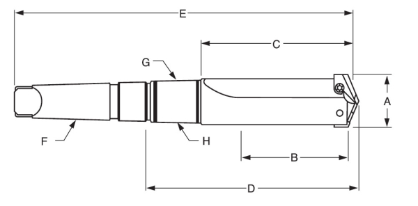 | Part No | Insert Series | Drill Insert Range "A" | Max Drill Depth "B" | Flute Lgh "C" | Ref Lgh "D" | Overall "E" | MT "F" | Pipe Tap "G" | RCA "H" | Price Per | Price | Quantity |